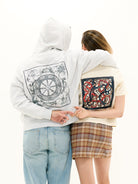 The back features a bold red + navy scarf-print graphic with leash chain details.