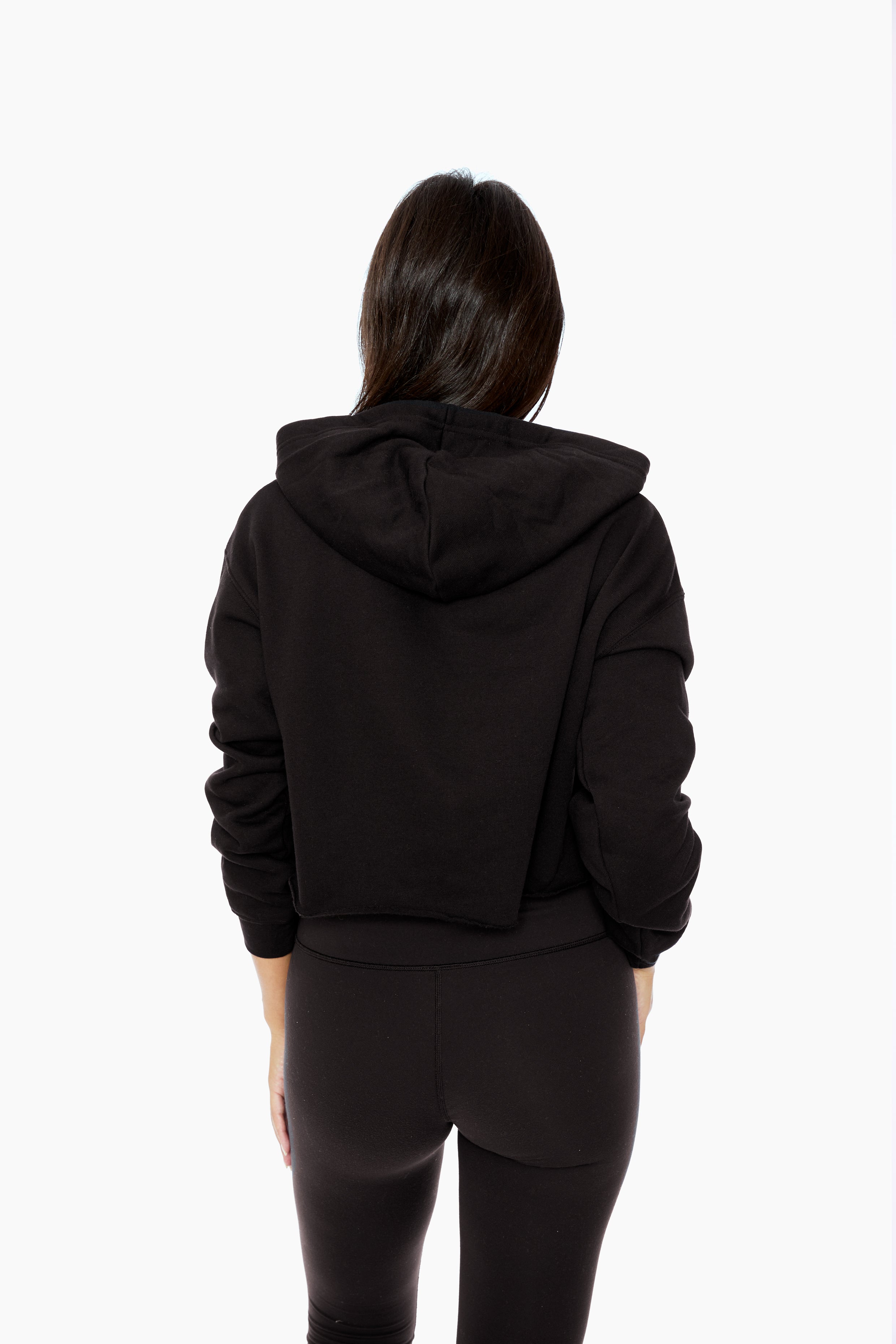 Cropped hoodie with raw cut hem. Made in a soft, plush fleece, which has a cozy feel, perfect for cooler weather.