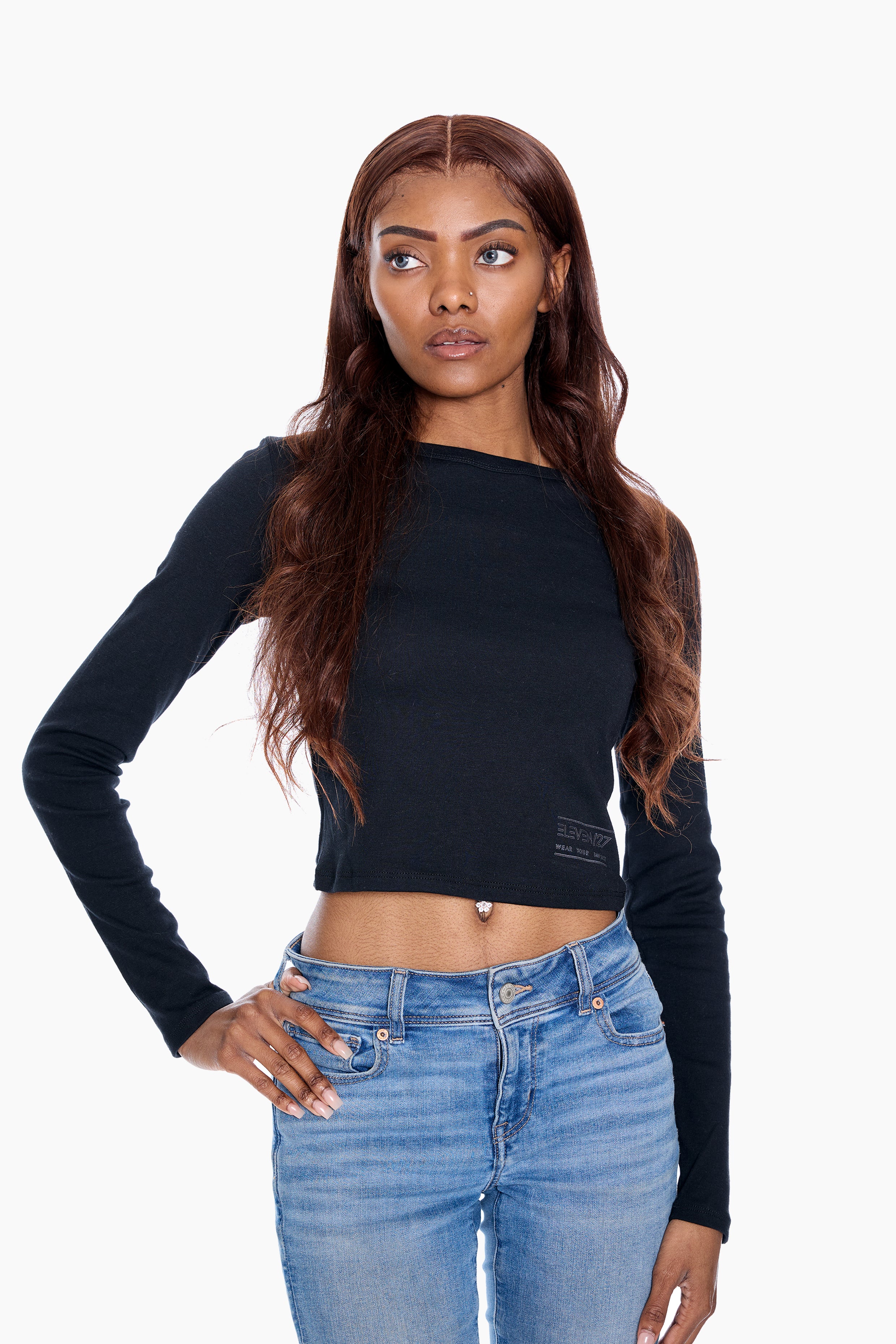 Long sleeve micro ribbed cropped tshirt with "Eleven27 - Wear Your Impact" graphic on the front.