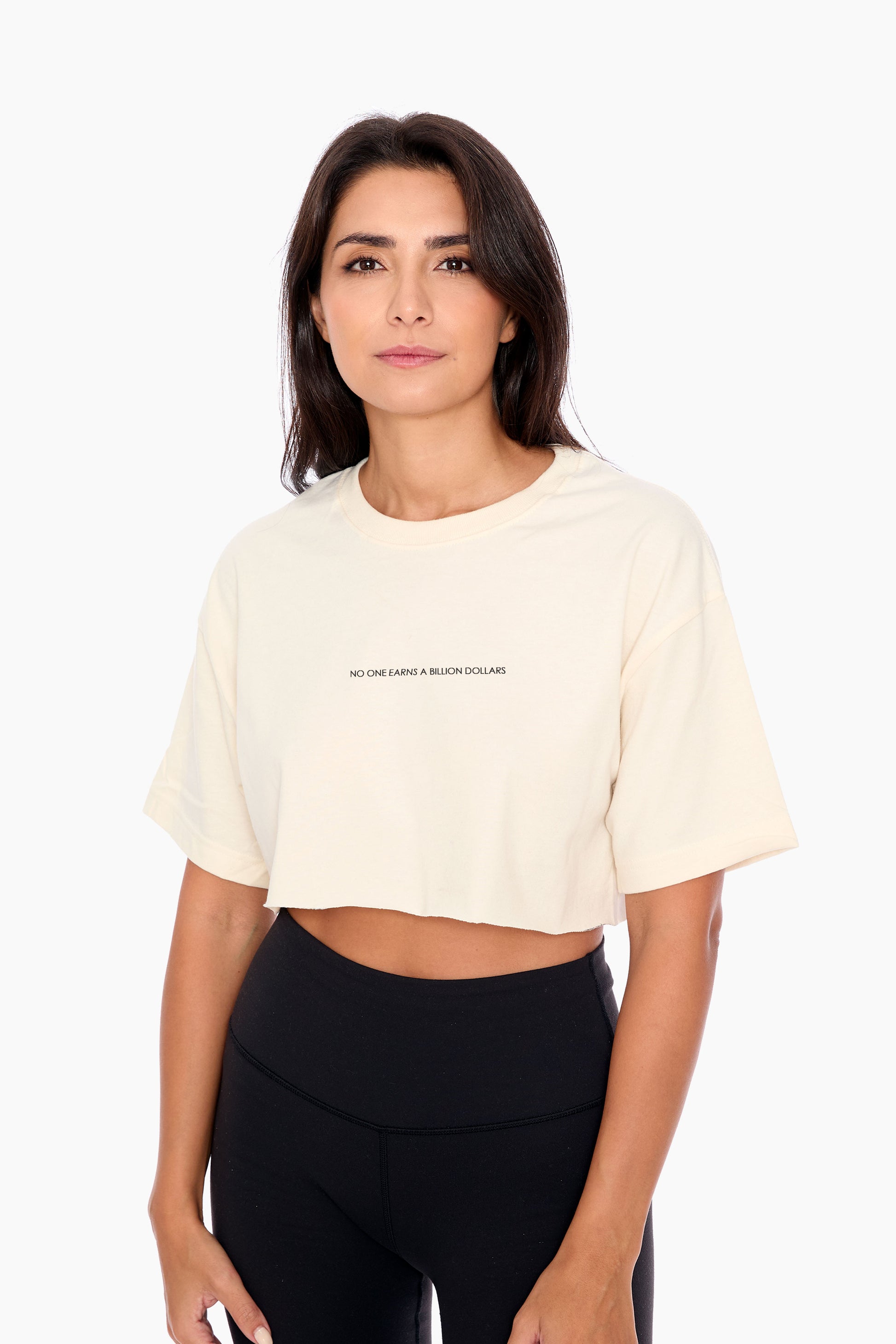 This raw hem cropped tee with "No One Earns A Billion Dollars" graphic on the front.
