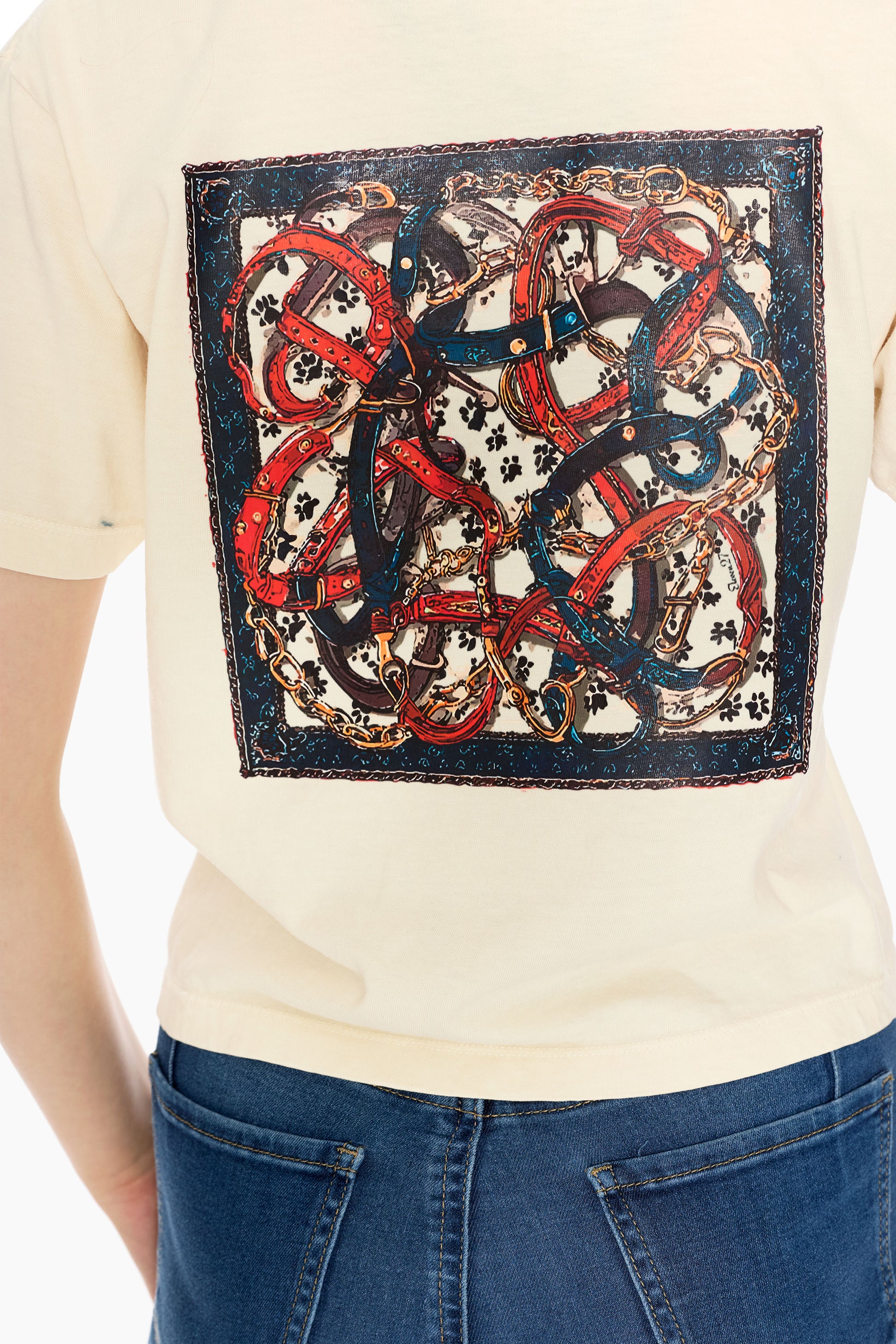 The back features a bold red + navy scarf-print graphic with leash chain details.